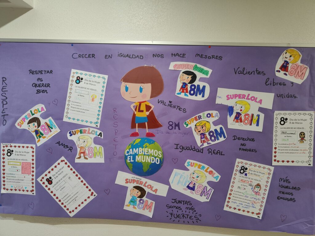 Posteriormente, realizaron un mural colectivo inspirado en la figura de Super Lola. Cada participante coloreó y pegó la protagonista del cuento y escribió diferentes palabras, mensajes y frases relacionadas con la igualdad, el respeto, la valentía y la importancia de seguir avanzando hacia una sociedad más justa. El resultado fue un mural lleno de color, ideas y compromiso, construido de manera conjunta por todos y todas.